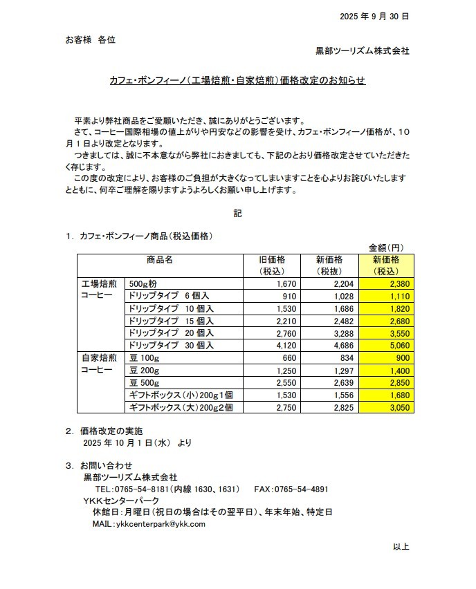 昨今の原材料の高騰が続いていることにより、誠に不本意ではございますが、カフェ・ボンフィーノ(工場焙煎/自家焙煎)の価格改定をさせていただきたく存じます。